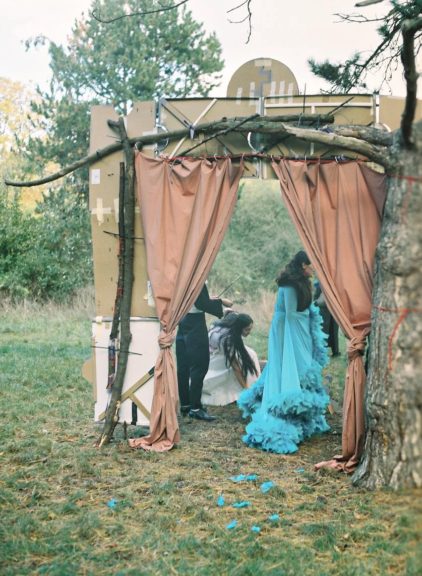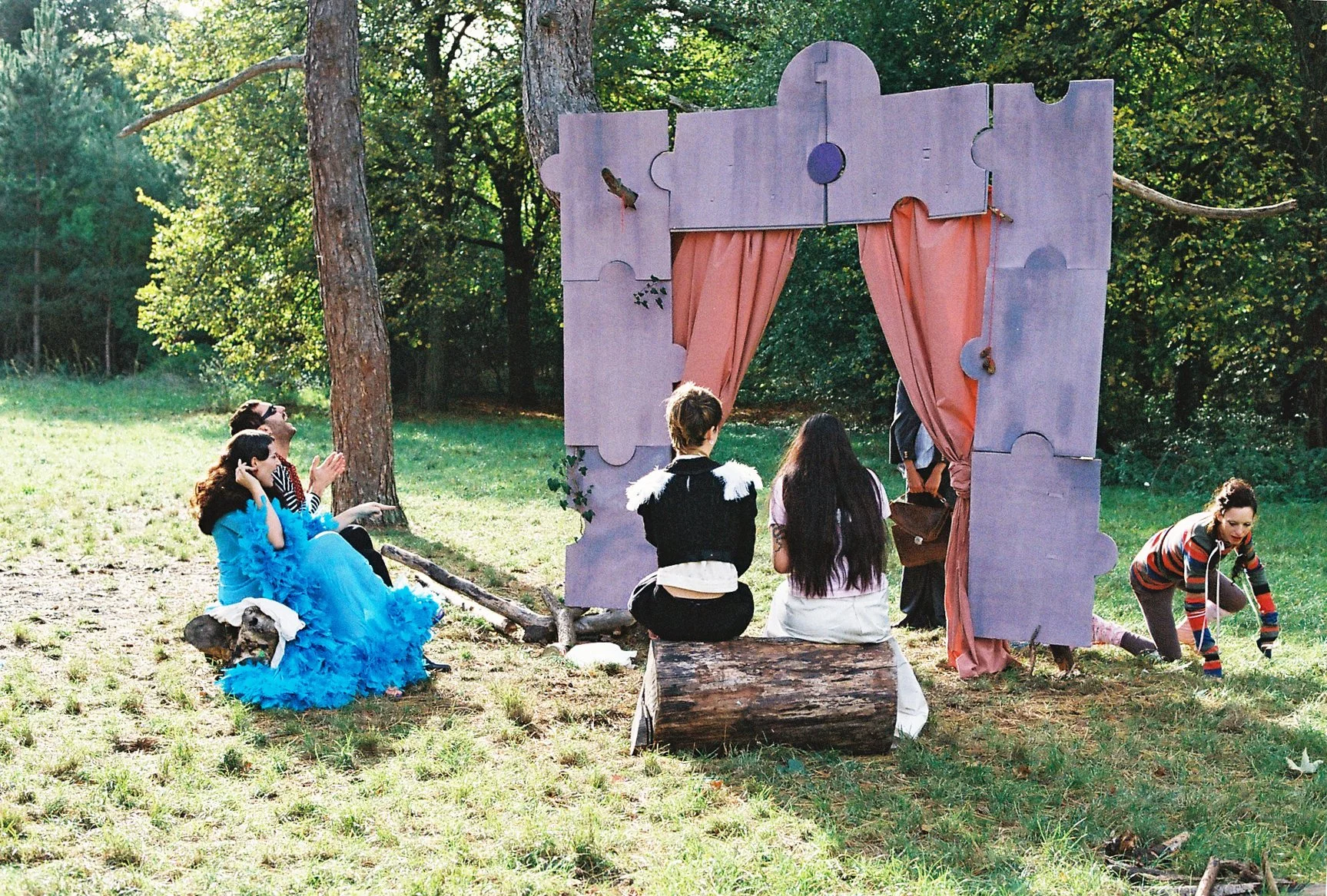 Dans une clairière, un groupe de personnes est assis autour d’une petite scène de théâtre itinérant, les rideaux se lèvent et le spectacle commence.